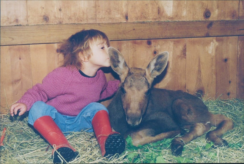 Our kids grew up thinking everyone had injured wildlife being nursed back to health on the kitchen counter. The photo is our daughter Liesl, age 4, with an orphaned moose we named Clifford. We found him a great home at the Milwaukee Zoo and eventually he became the oldest living moose in captivity.