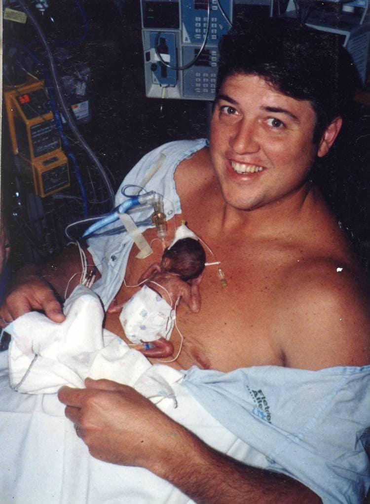 Our greatest teacher – our daughter Louisa – was born four and a half months early, when I was pregnant for only 23 weeks and 5 days, (there are no living 22 weekers without enormous disabilities). She was weighed a little more than one pound. Here’s a photo with her on Dr. Chuck’s chest at only ten days old. Her tiny diaper – too big for her – was just a bit bigger than a playing card folded in half!