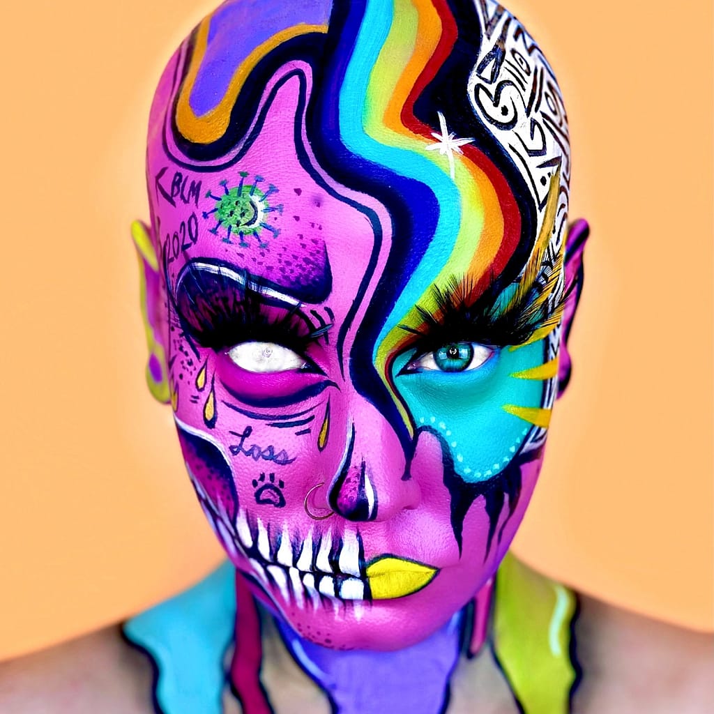 An advocate is not all she is, either; Abby is also creative makeup artist and seasoned video creator, and she blends her vibrant artistry with compelling videography that encourages others to embrace their individuality through bold creative expression. Her bald head has become her unique canvas for work like this: